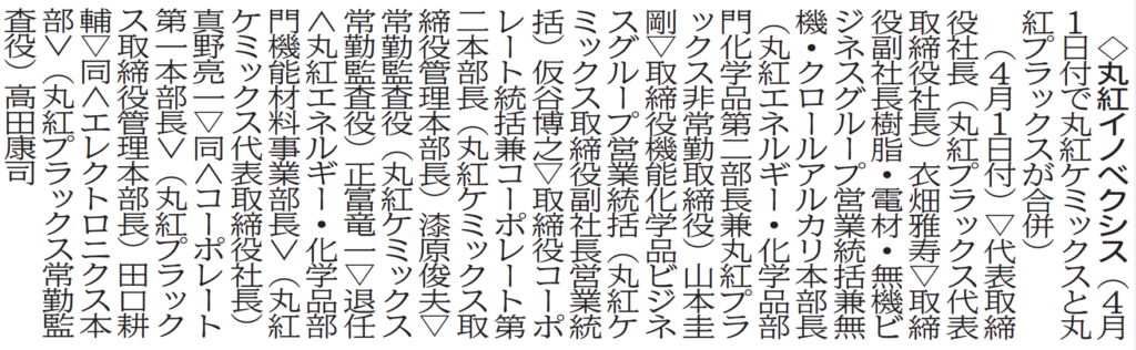 プレスリリース 人事異動 組織改編 展示会 採用 製品・技術 その他 化学工業日報に、新会社「丸紅イノベクシス」に関する機構・人事情報が掲載されました。 2026年3月18日(水)付 化学工業日報 9面 に「社長に衣畑氏 丸紅イノベクシス」、「丸紅イノベクシス(機構・人事)を含む」が掲載されました。 転載・複写 禁止 2026-03-19 プレスリリース